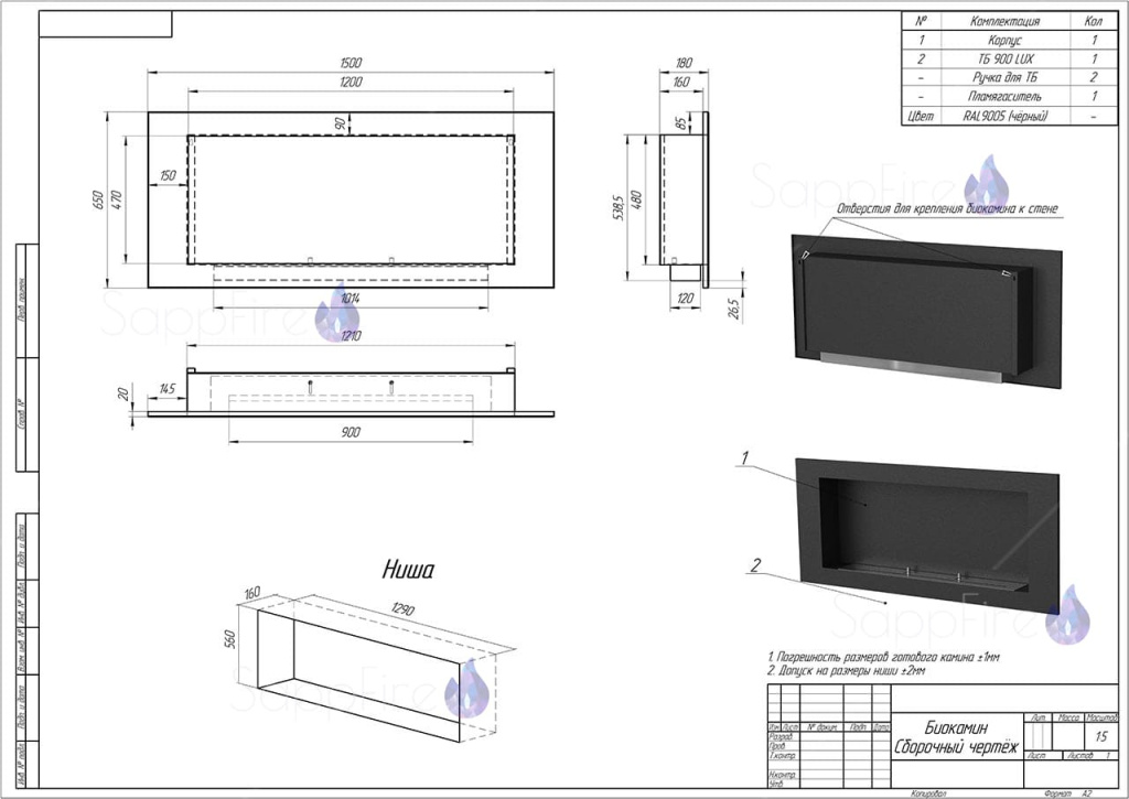 Инструкции, чертежи, документы - Настенный биокамин SappFire Mercury Stemalit 1500