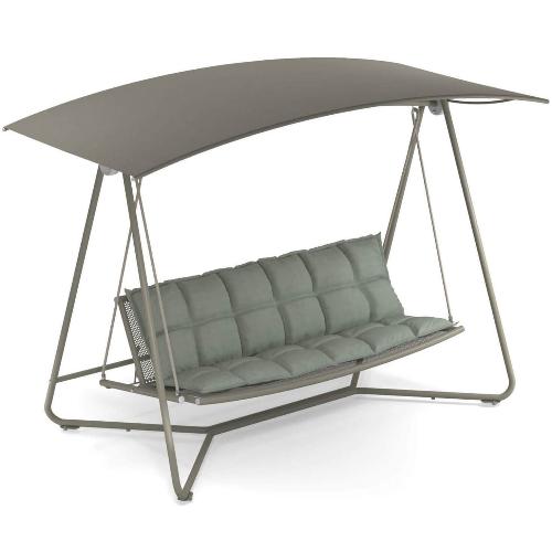 Reel - это «диван-качели», который трансформируется в большую и удобную кушетку, поскольку спинку можно легко отрегулировать в соответствии с потребностями. Дополняющий его солнцезащитный козырек, также наклоняемый и регулируемый, позволяет свету естественно и деликатно проникать внутрь, обеспечивая максимальное расслабление. Концепция, лежащая в основе дизайна Reel, - это изгиб, как улыбка, приглашающая Вас в интимное и расслабляющее путешествие вдали от хаоса и стресса повседневной жизни, которая нас окружает. Reel приглашает нас играть и мягко качаться в постоянном балансе между формальной преемственностью, элегантностью и удобством использования.