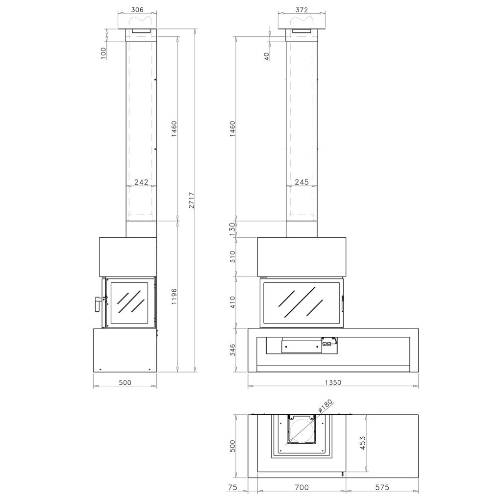 прямоугольную форму, дымоход с выходом сверху и пристенное расположение. Труба дымохода скрыта под металлическим кожухом, который завершает стильный образ