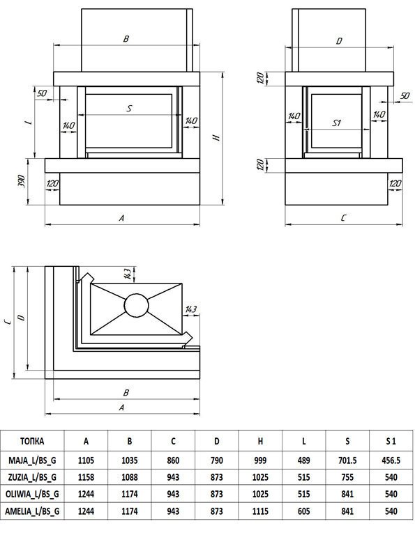 Инструкции, чертежи, документы - Каминная облицовка FireBird Ладога (для топки Zuzia/LP/BS/G) (угловое стекло слева-справа, гильотина)