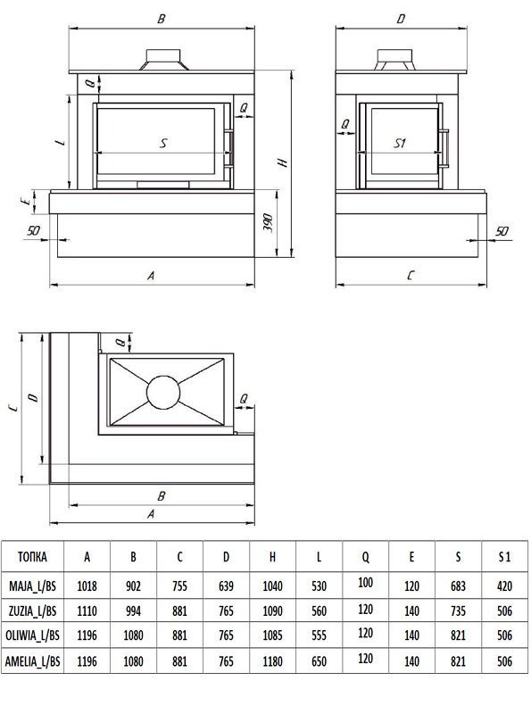 Инструкции, чертежи, документы - Каминная облицовка FireBird Онега (для топки Amelia/LP/BS) (угловое стекло слева-справа)