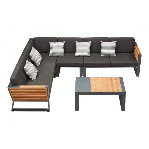 Для подушек выбран олефин, материал на основе полипропилена, легкий, с низкой степенью влагопоглощения и быстросохнущим. Превосходная устойчивость к солнечному свету и плесени, и, прежде всего, материал, который не выцветает. Идеально подходит для этой коллекции, где преобладает черный цвет: от черного цвета обивки до черного цвета алюминиевой конструкции с порошковым покрытием, которые, в отличие от искусного использования тикового дерева, создают ощущение сильной динамики.