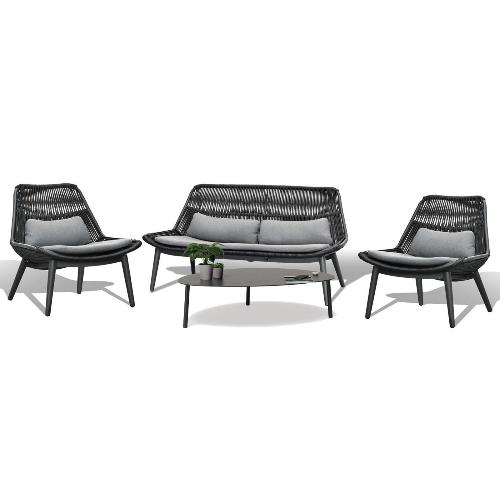 Комплект Como - это двухместный диван, два кресла и низкий столик из алюминия. Плетение дивана и кресел выполнено из акрилового каната Ø9 мм. Подушки на сиденьях и спинках выполнены из олефина - материала, устойчивого к пятнам и ультрафиолетовому излучению. Такой комплект будет уместен как в частных зонах отдыха, так и на террасах отелей, кафе и баров.