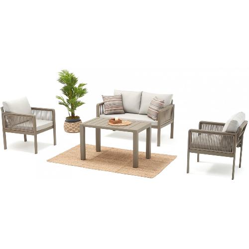 Уличный комплект мебели для отдыха Genova, включающий двухместный диван, два кресла и кофейный прямоугольный столик, идеально подходит для создания комфортной и стильной зоны отдыха на открытой террасе отелей, ресторанов и кафе. Его алюминиевый каркас обеспечивает прочность и долговечность, а плетение из роупа придает мебели современный вид и устойчивость к внешним воздействиям. Подушки со съемными чехлами из олефина не только добавляют уюта, но и легко могут быть очищены от пятен, что делает этот комплект идеальным для общественных мест и домашнего использования. Благодаря своей элегантности и функциональности, он станет привлекательным дополнением к любому экстерьеру, где гости смогут наслаждаться отдыхом под открытым небом в уютной обстановке.