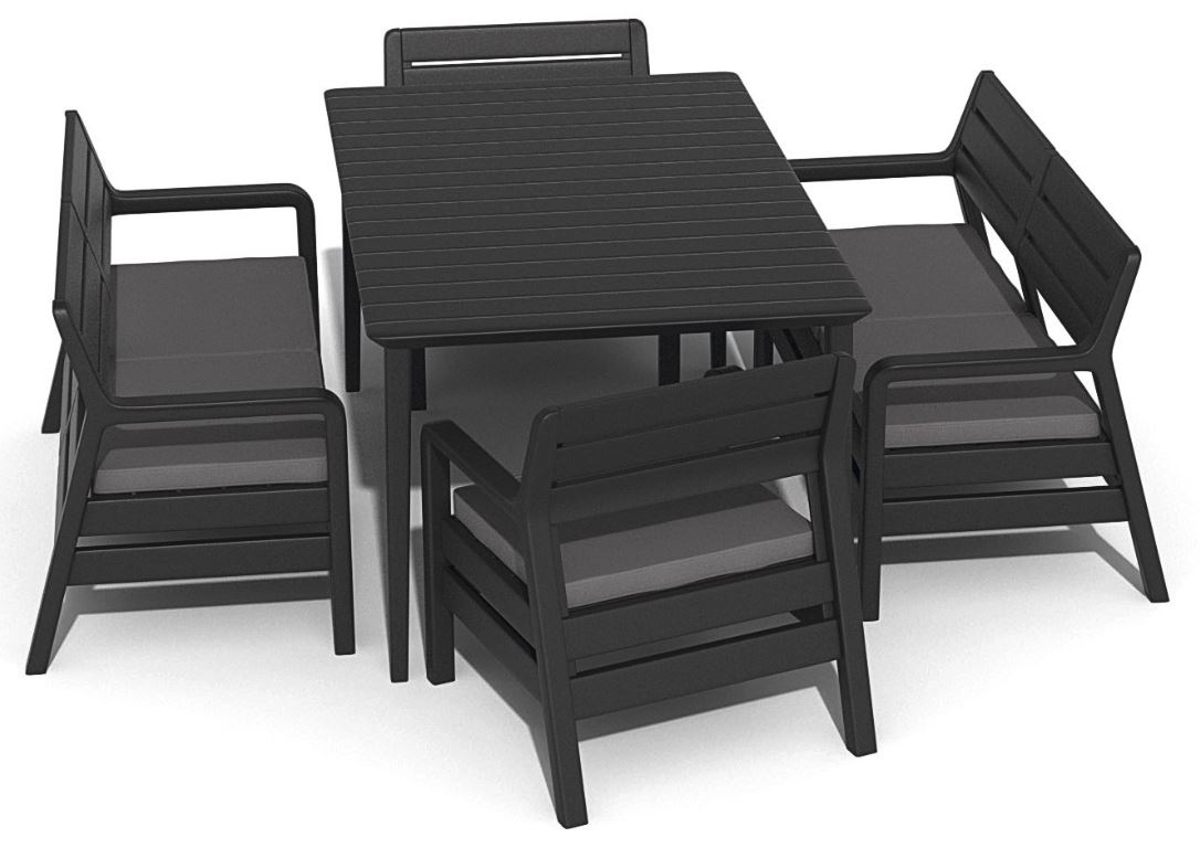 Делано - набор мебели с фактурой, напоминающей деревянные панели. В состав гарнитура входят 2 дивана, два кресла с подлокотниками и большой прямоугольный стол определяющий комплект как обеденный. Идеально подходит для использования на домашних балконах, террасах или в саду. Легко собирается и чистится. Стойкий к воздействию погодных условий и УФ-излучения.