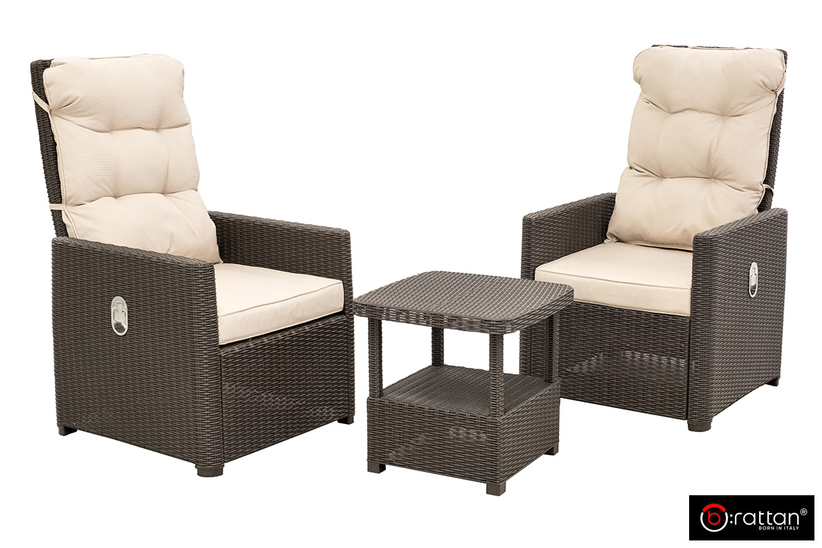 Премиальная итальянская мебель для сада и уличных кафе MANCHESTER SET 2 от итальянского производителя B:Rattan, включает два кресла-шезлонга и столик. Пластиковый комплект порадует любителей плетеной мебели своей фактурой в стиле ротанг и прочностью: максимальная до 150 кг.