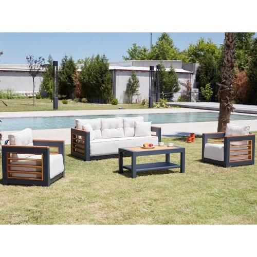 Уличный комплект мебели для отдыха Larix, выполненный в современном стиле и включающий трехместный диван, два кресла и кофейный прямоугольный столик, идеально подходит для использования на террасах отелей, ресторанов и кафе, а также в частных домах, где важно создать уютную зону для отдыха. Алюминиевая структура контрастирует с открытой конструкцией панелей из ироко, обеспечивая полноценный поток воздуха, который дает конструкции практичность, возможность дышать и ощущение эстетической легкости. Подушки со съемными чехлами из олефина не только добавляют уюта и мягкости, но и легко могут быть чистыми и ухоженными в любое время. Такой комплект мебели станет привлекательным и функциональным решением для обустройства открытых пространств любого заведения или дома.