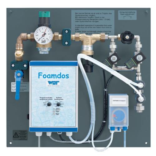 Невозможно представить турецкую баню без пенного массажа. WDT создали специальную машину, которая создает мягкую пену. На синей плате предварительно смонтировано оборудование, которое подключается к системе водоснабжения. Для начала работы необходимо залить мыльный раствор в специальный резервуар. Плата монтируется в техническом помещении, в самом хамаме выводится лейка, которая при нажатии на кнопку подает пену. Дозирующая станция FOAMDOS, используя 3 компонента, а именно воду, воздух и пенный концентрат, производит пену, которая наносится на тело посетителей при массаже в турецкой бане.