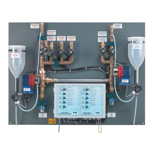 Полная коммутация и предварительный монтаж на синей полипропиленовой пластине всех управляющих компонентов душа.