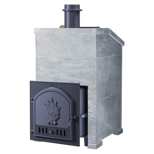 Поток Б, поступает через колосниковую решетку в нижнюю часть первой камеры. Поток В по отдельному воздушному каналу попадает во вторую камеру дожига расположенную под каменкой печи. Здесь он смешивается с огнем, вызывая активное горение пиролизных газов и резкий рост температуры. Это позволяет менее чем за 1 час нагреть массивную каменку с закладом до температур свыше 600С. Каменка находится внутри топки и нагревается прямым огнем со всех сторон. Огромный запас тепла в такой каменке делает печь «незаливаемой». На камни можно лить воду для получения мелкодисперсного и легкого пара в количествах, многократно превышающих стандартные нормы для парных помещений. Без такого пара невозможно создать микроклимат настоящей Русской Бани.