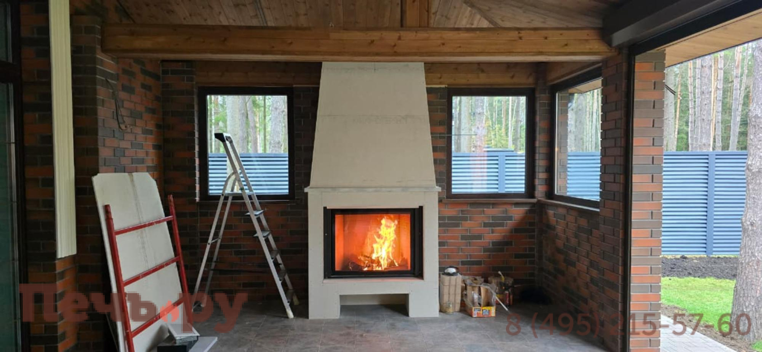 Футеровка светлая и темная на выбор. Открывание двери - гильотина. Чистое стекло. Подовое горение. Подача воздуха извне.