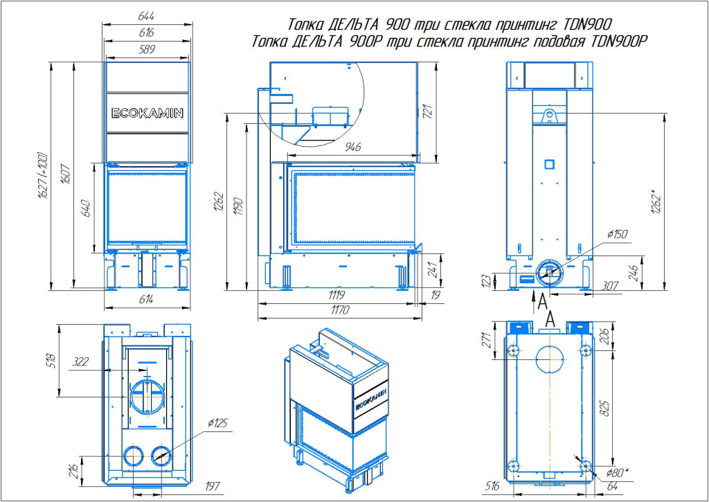 Инструкции, чертежи, документы - Каминная топка ЭкоКамин Дельта 900 PB три стекла подовое горение принтинг черный шамот