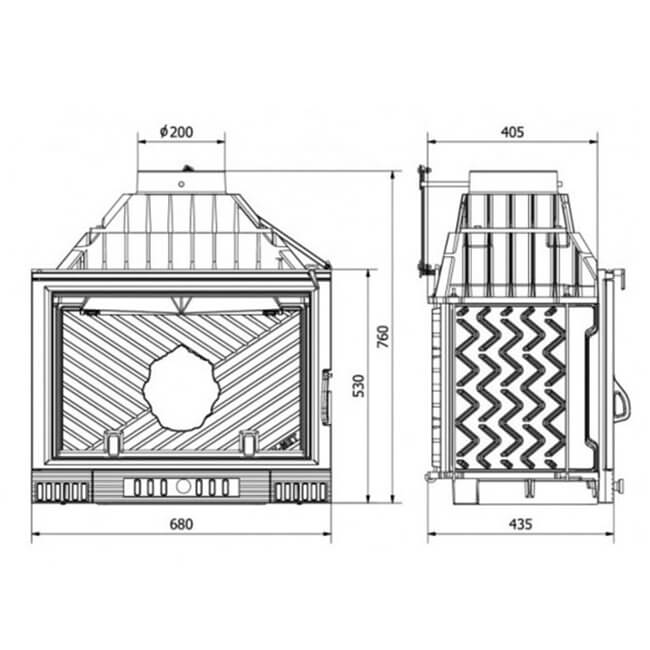 Регулировка шиберной заслонки позволяет контролировать интенсивность процесса горения. Блокиратор каминной дверцы ограничивает её открытие при закрытом положении шибера, что исключает возможность попадания дымовых газов в помещение.
