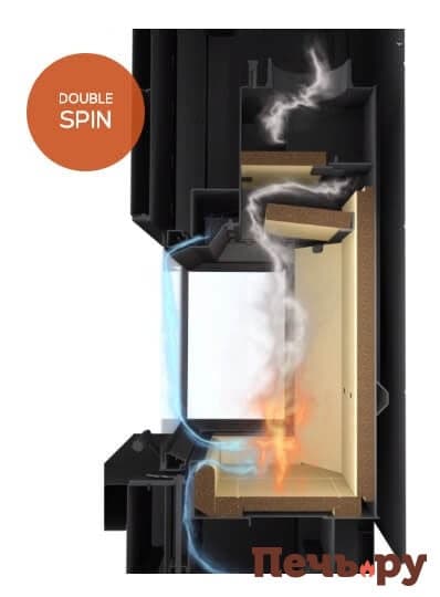 Для удобства пользования – инновационный роликовый механизм подъёма дверцы: точный, лёгкий и совершенно бесшумный. Единый элемент управления подачей и первичного, и вторичного воздуха. Подключение дымохода DOUBLE SPIN возможно как сбоку, так и сверху.