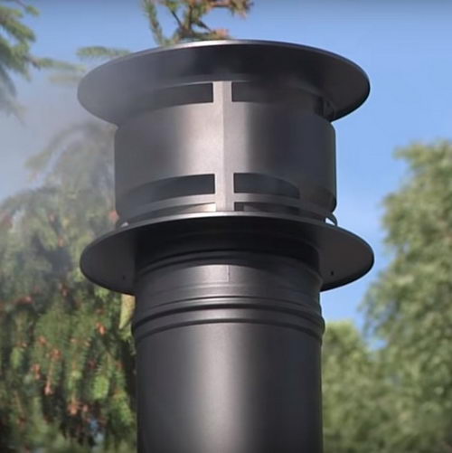 Остается установить навершие, которое закрывает дымоход от осадков. Если оно выполнено в виде дефлектора, то при боковом ветре усиливает тягу и обладает искрогасящим эффектом. Это важно, потому что труба дровяная, дымоход короткий. Если не будет искрогашения, то возможны всякие неприятности вплоть до пожаров.